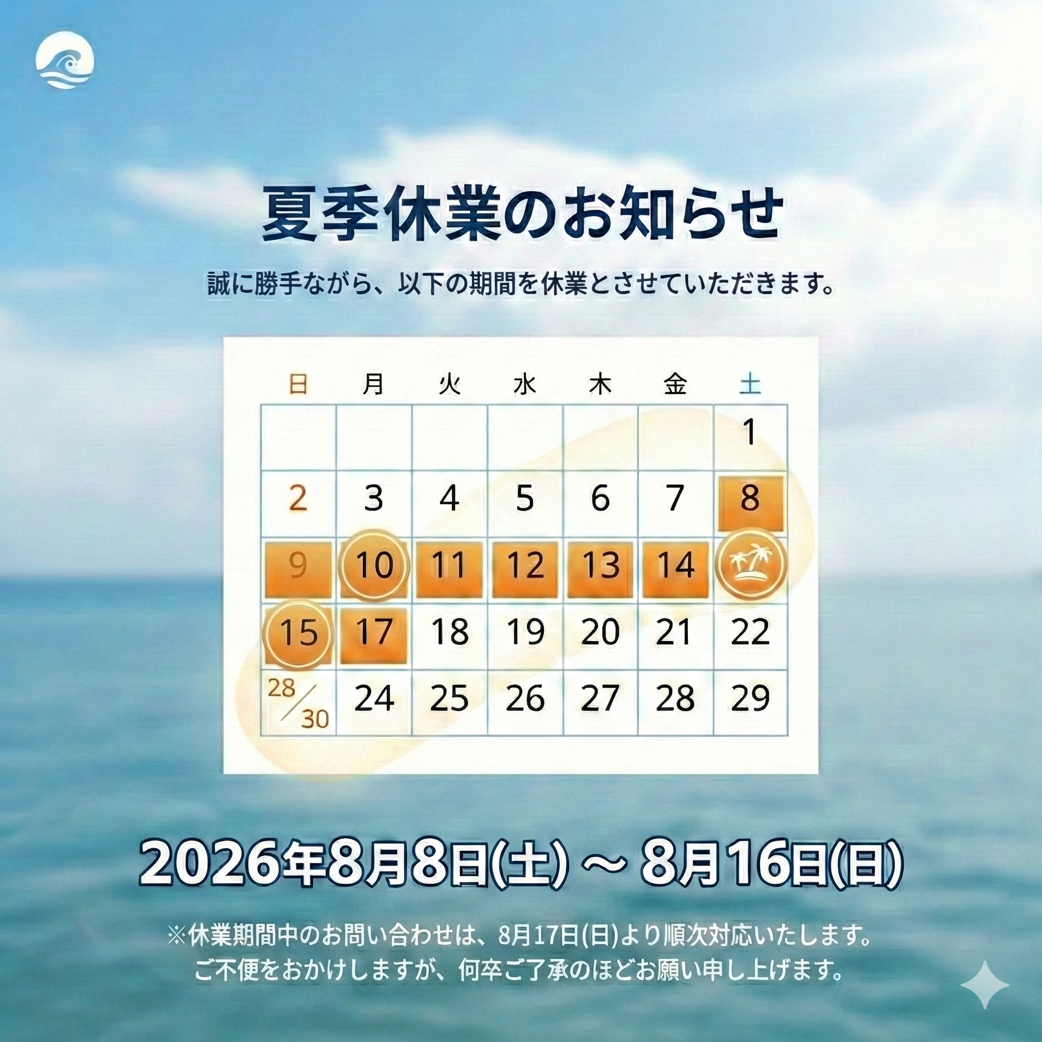 【休業期間】 2026年8月8日(土)~ 2026年8月16日(日)